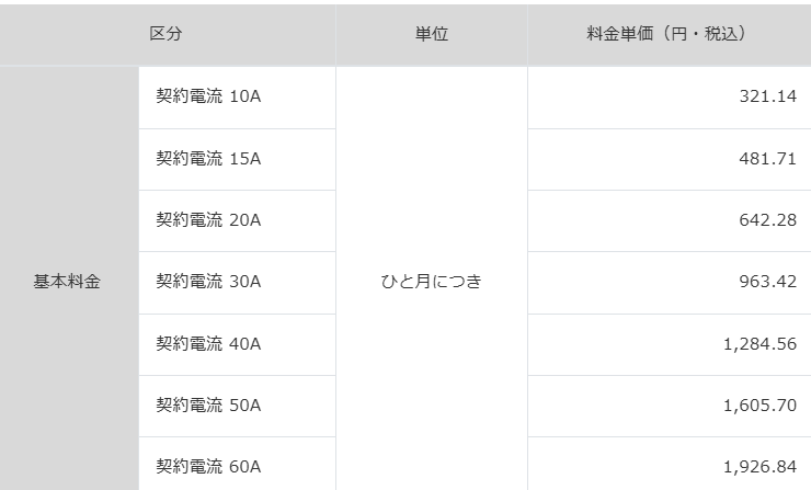 | 契約電流(アンペア) | 1日当たりの金額(円) | 1ヶ月当たりの金額(※)1 | |