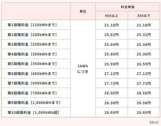 電気の料金体系としては一般的な段階従量単価を採用していますが、他社プランでは3段階が多い中、東邦ガスの電気料金プランは10段階となっています。