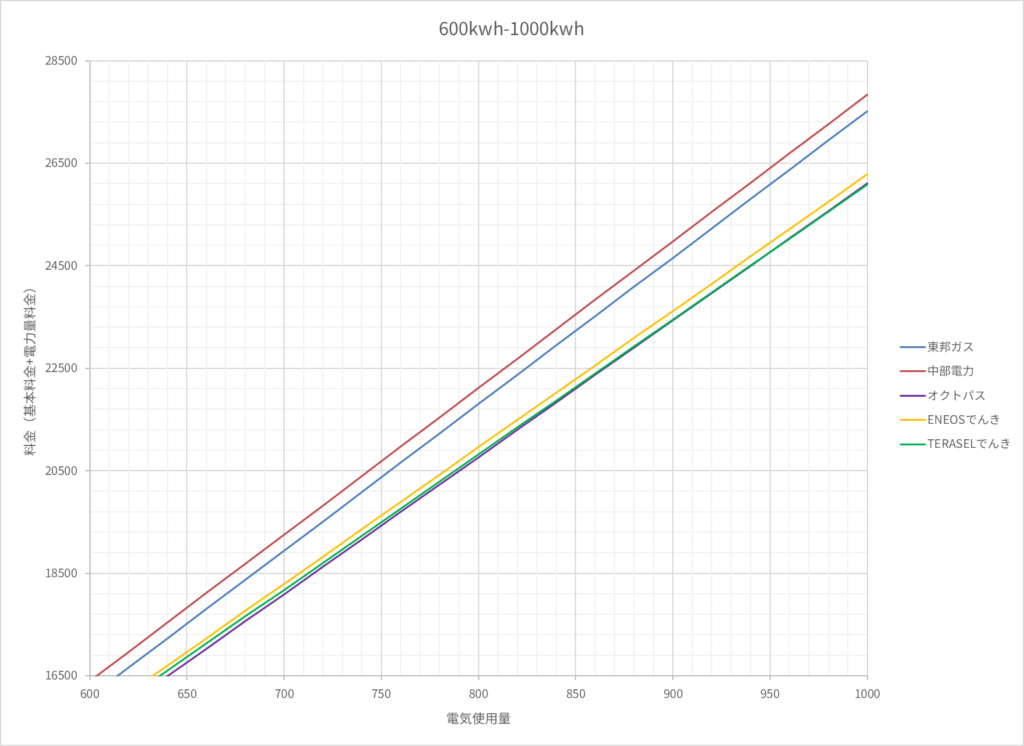 電気料金(基本料金+電力量料金)の比較グラフは以下の通りで、東邦ガスの電気料金は常に中部電力を下回っています。